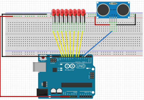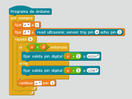 Realizar un programa que visualice con las luces la distancia que detecta el sensor de ultrasonidos.