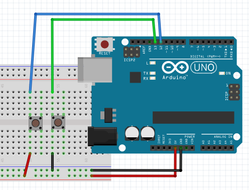 El segundo pulsador cuando se cierra sí que proporciona 0V al pin 13 por el pin verde pero... ¿y cuando no está pulsado?