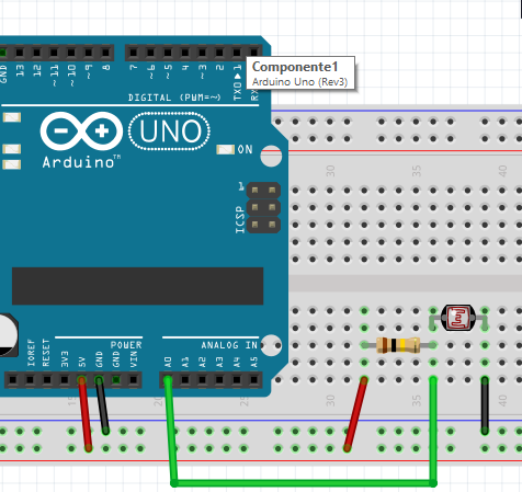 Si se coloca en serie con una resistencia de un valor parecido, el punto de unión (cable verde) tiene una tensión variable con la luz que lo puede leer Arduino, en este esquema lo lee por la entrada A0