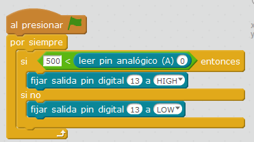 Realizar un programa con la configuración de pulsador pull down en la entrada analógica A0 y un led en el 13, que cuando se pulse se encienda el LED