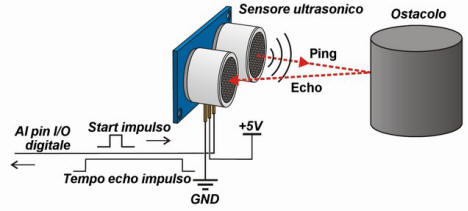 Según el tiempo entre el pulso y el eco (T), la distancia a la cual se encuentra el objeto es : distancia = T * velocidad_sonido/2