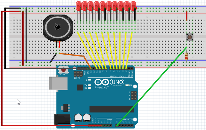 El pulsador con la resistencia pull-down al pin A0 y las luces como en los ejercicios anteriores del 2 al 11, el altavoz en el pin 13: