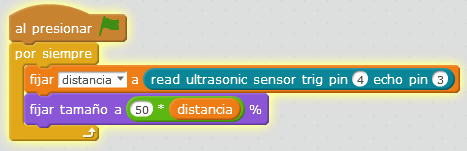 En este caso, como la el sensor de ultrasonidos va desde 2 cm a 300 cm, nuestra propuesta es que el tamaño se cambie multiplicado x50 ese valor, es decir "cambiar tamaño 50xdistancia", de no hacer esto, la pelota sale demasiado pequeña, o el objeto tendría que estar muy lejos para que se vea a un tamaño razonable.